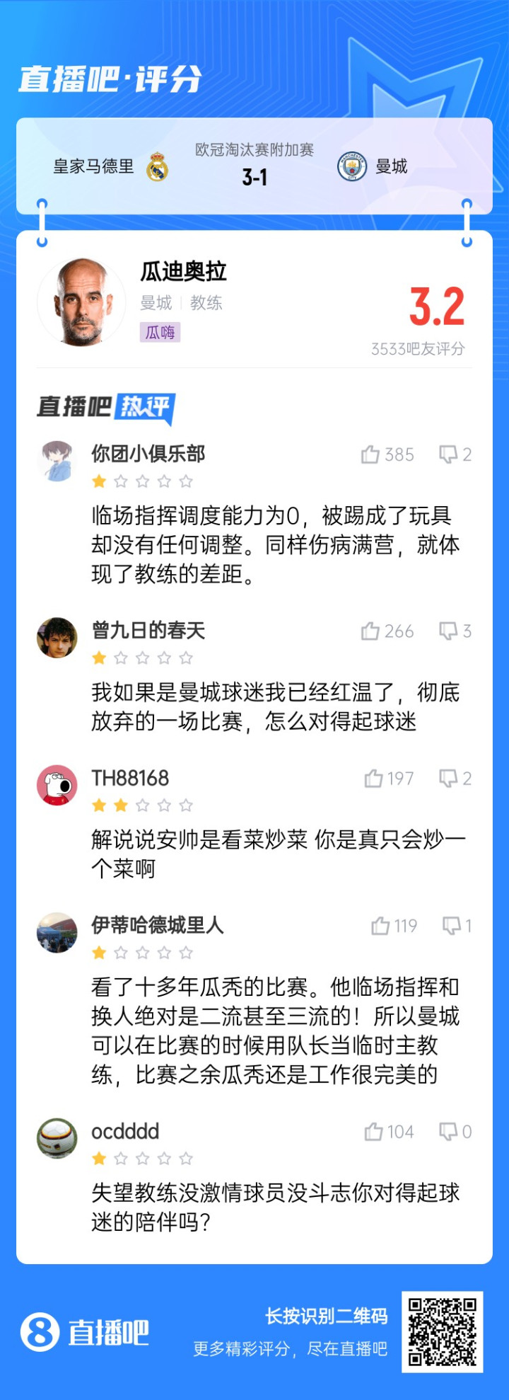 瓜嗨吧友给瓜帅打3.2分: 临场调遣为0, 你是真只会炒一个菜体育集锦