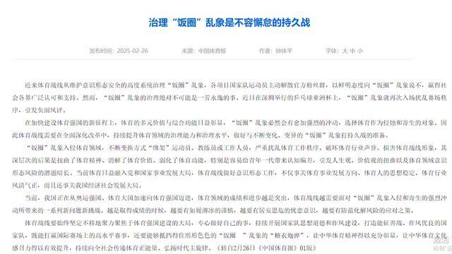 2月26日,体育总局转发了一条中国体育报的著述,题目为《治理“饭圈”乱象是辞谢懈怠的捏久战》,在著述中,再次强调了饭圈乱象侵入体育范畴,换着法的勒诈通顺员和耕种员,龙套体育秩序,误解体育精神。尽头点名了在深圳举办的乒乓球亚洲杯,说“饭圈”乱象就再次入场扯后腿赛场秩序,激励负面风评。